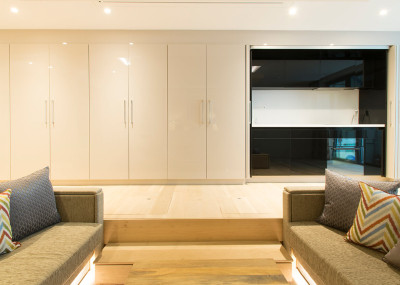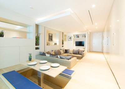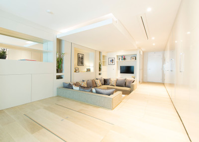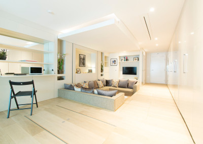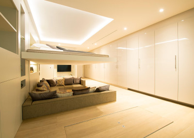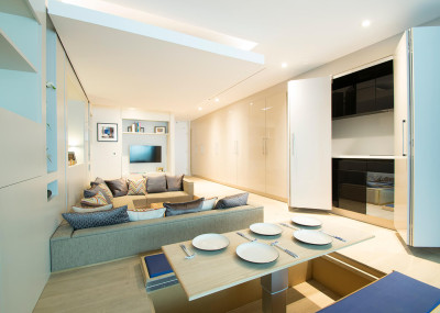 Výsledek? Dokonalý byt, v němž se postel skrývá ve stropě, kompletní kuchyň ve skříni, jídelní stůl zase v podlaze…  Jednotlivé části tak můžete schovávat a zase vynášet do prostoru podle aktuálních potřeb. Všechno máte ve svých rukách.